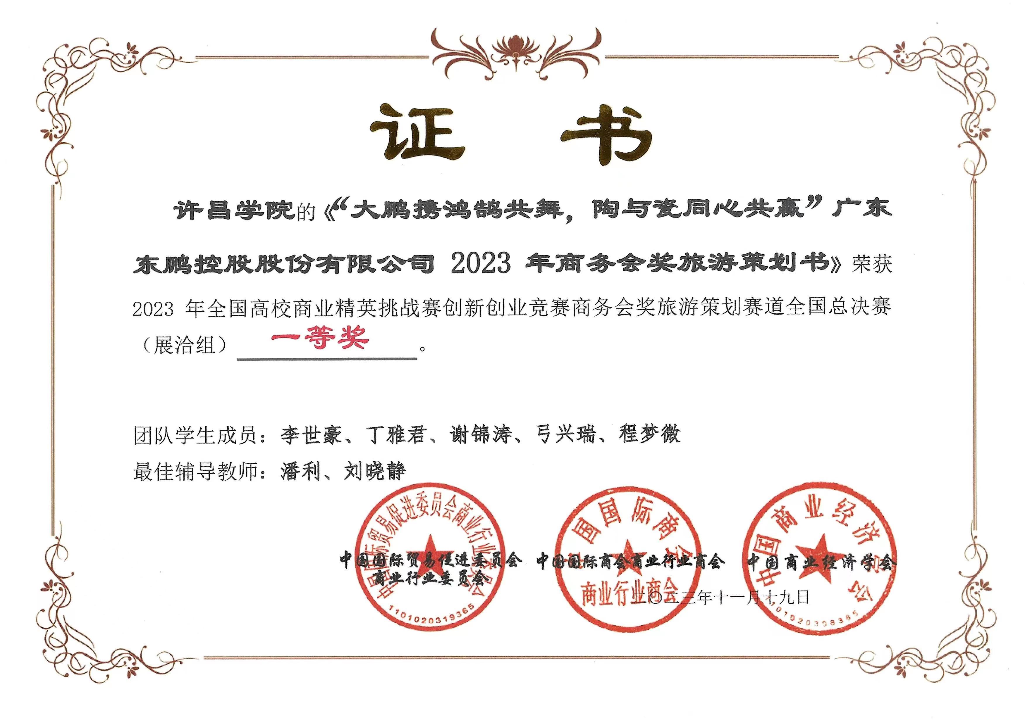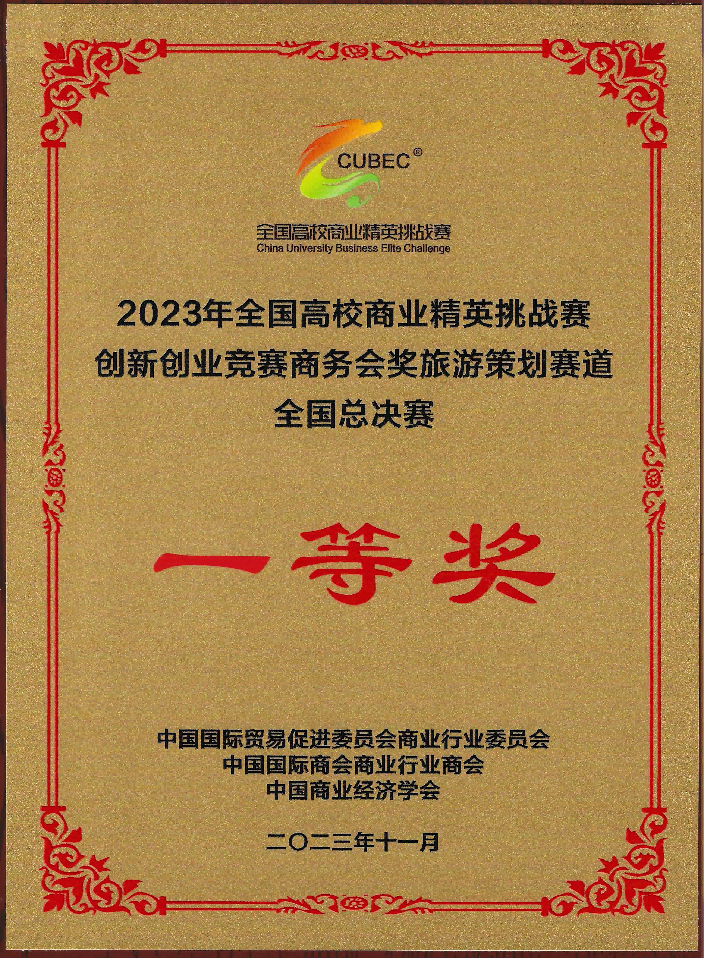 11月17日至19日,2023年全国高校商业精英挑战赛创新创业竞赛商务会奖旅游策划赛道全国总决赛在河南省三门峡举行。由威尼斯官网教师潘利、刘晓静指导,2022级旅游管理专业李世豪、丁雅君、弓兴瑞、程梦微、谢锦涛等5名学生组成的参赛队,凭借精心的策划与沉稳的现场发挥,最终荣获总决赛一等奖和展洽赛道一等奖,并进入全国十强,获得赴新加坡商务活动策划大赛入围资格。