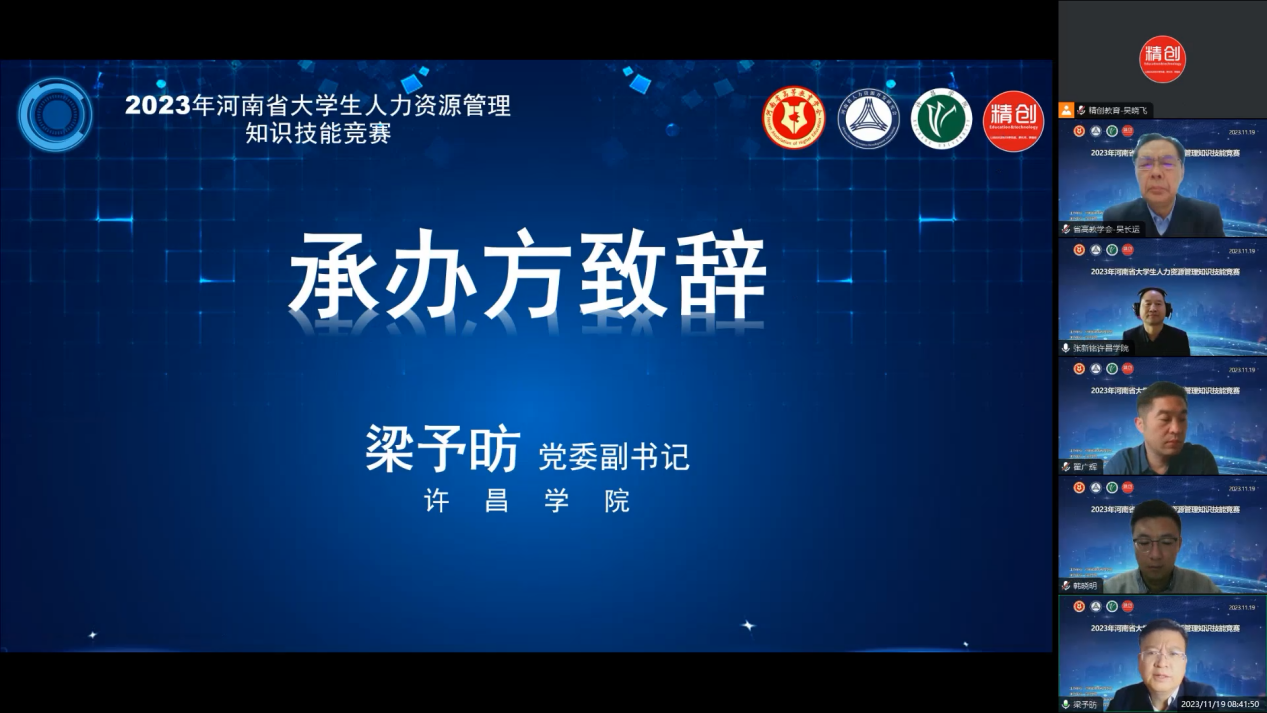 11月19日,2023年河南省人力资源管理知识技能竞赛线上开幕。河南省高等教育学会秘书长吴长运、河南省高等教育学会办公室主任杨颖超、河南省人力资源开发研究副会长韩晓明、许昌学院党委副书记梁予昉、1066vip威尼斯党委书记翟广辉、浙江精创教育科技有限公司副总经理金斌等领导和嘉宾出席开幕式。开幕式由1066vip威尼斯院长张新铭主持。