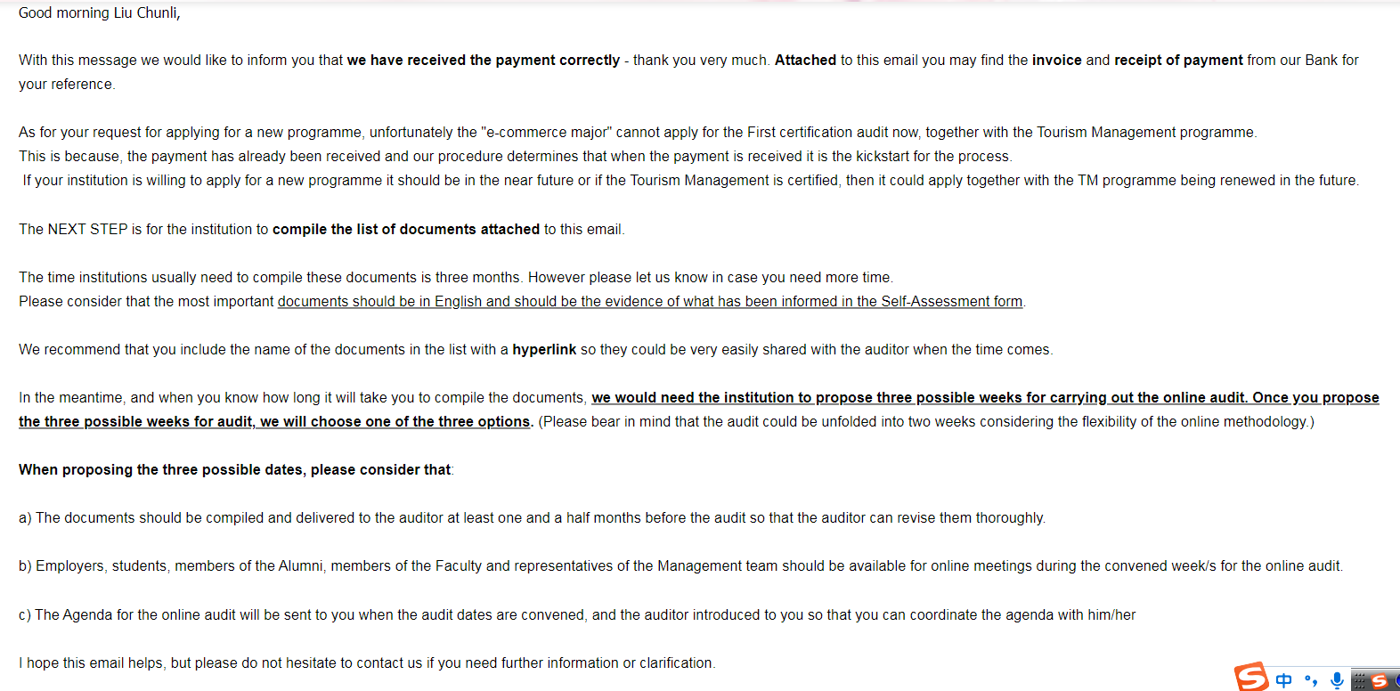 2023年11月13号,威尼斯官网旅游管理专业收到联合国世界旅游组织教育质量认证组织的邮件,经过专家全面评估后,审评通过旅游管理专业的自评报告,允许进入下一阶段的认证评审。