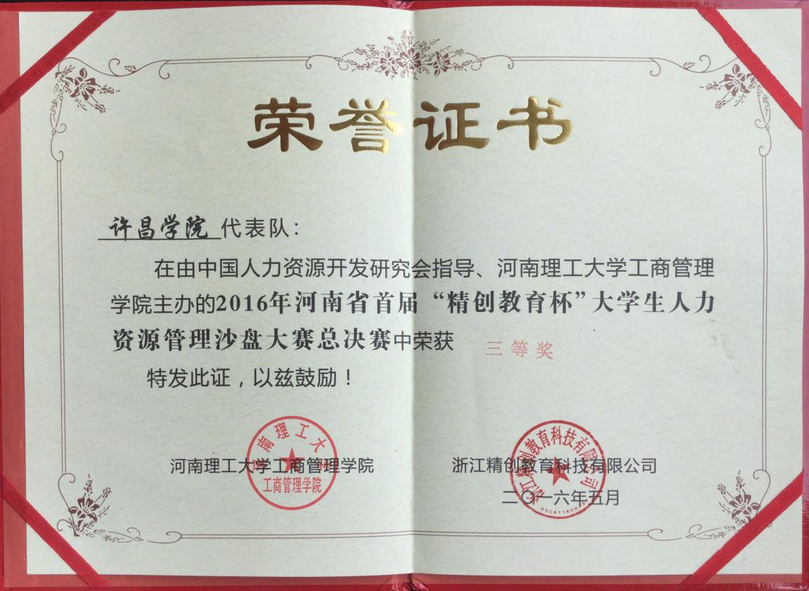 本次大赛由中国人力资源开发研究会全面指导,河南理工大学工商管理学院主办,浙江精创教育科技有限公司提供全面技术支持,以“创新点亮未来创业成就梦想”为主题,采用电子沙盘与物理沙盘相结合的方式,通过虚拟公司六年经营的模拟,对抗人力资源管理效率和技能。大赛吸引了省内众多高校,河南理工大学、河南财经政法大学、河南农业大学、万方科技学院、新乡医学院、黄河科技学院、航空科技管理学院等12所高校的14支代表队参加了此次大赛。在历时两天的比赛中,威尼斯官网学子沉着冷静,从容应战。将理论知识与实践充分结合,赛出了风格,赛出了水平,最终斩获三等奖。大赛不仅展了威尼斯官网学子较强的综合应用能力,同时也展示了许院学子的精神风貌。