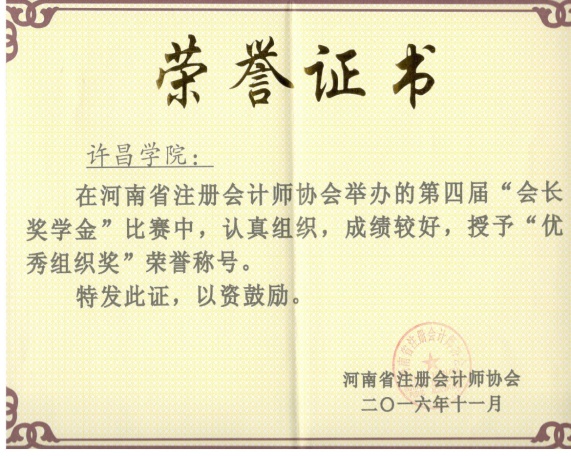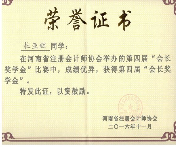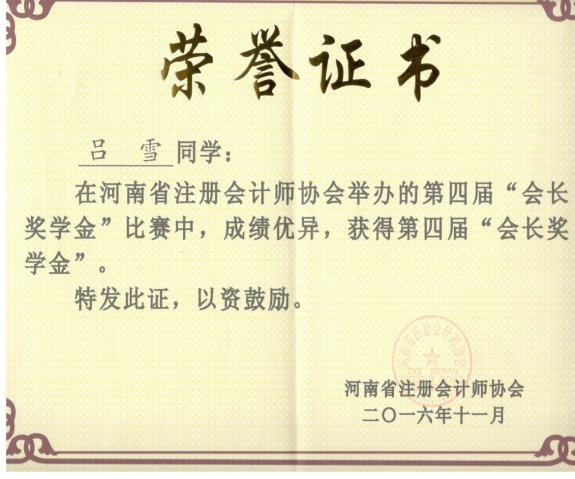 经过河南省注册会计师协会委托没有学生参赛的高校专家对试卷评阅,本届“会长奖学金”共有来自26所高校的200余名同学获奖。威尼斯官网13级工商管理专业(会计方向)同学吕雪和13级财务管理专业同学杜亚辉分别获奖。