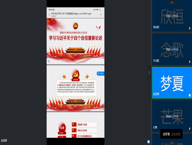 此次团课以线上形式开展,通过钉钉APP进行。团课开始,武梦夏老师首先表示本节课将会以与实际结合的授课方式进行。武梦夏老师从实际说起,和同学们聊团课,带领同学们领会上团课的目的以及意义。随后,她讲解了本节团课的重点内容,通过分析全球疫情的状况,向同学们展示了“四个自信”的优势。同时,武老师与同学们进行互动,开展“云”交流。虽不能面对面交流讨论,但团课培训成员的积极性依旧高涨,课堂参与度依旧很高。