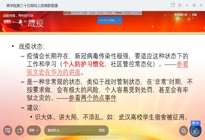 此次课程以“战疫有我,青年在行动”为主题,郭少辉老师在线上召开视频会议,围绕“战疫”和“青年”进行授课,号召同学们在这个特殊的时期,作为青年团员,要树立起“战疫”的精神,树立起“有我”的意识。并向同学们提出建议:不当局外人、不做旁观者,要成为亲历者、参与者和承担者。独善其身,做好自身防护,不添乱。在团课结束之余,郭少辉老师放映了商院志愿者的先进事迹,借用习近平总书记对当代青年提出的八字箴言:勤学、修德、明辨、笃实,对团课成员进行激励,希望每位同学都能够成为国家贡献自己力量的优秀大学生。