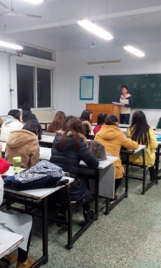 为加强我校大学生学风建设,形成“以学为先、以学为荣”的良好风气。2015年11月17日,管理(经济)学院13级会计1班在A座教学楼413室举行了关于“班级学风建设”的主题班会。13级会计一班全体同学参加此次班会,班长余凯旋,学习委员张玲玲主持此次班会,其他班委协助举行。