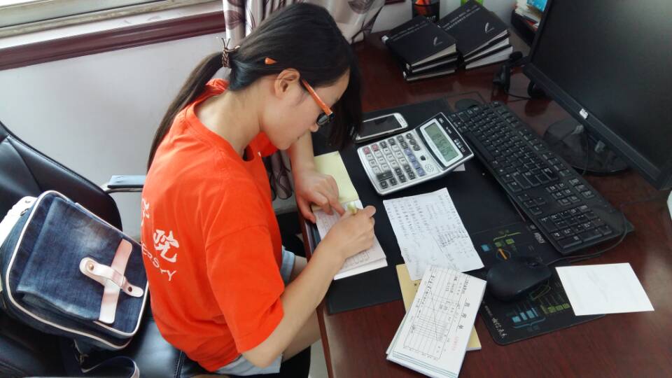 在专业人员会计师的讲解下,队员们了解了该公司的财务运行状况以及公司会计所要负责的日常单据的基本填写规则。首先,大家面临的第一个任务是填制该公司的一沓资产负债表,队员们在大一所学习的课程——基础会计课中学习到了该表的基本填制方法。基础会计课中的理论知识恰如其分地运用到实践中,使得队员们既得心应手的完成了工作,又使所学课本知识得到了升华。两个小时的工作之后,稍作休息。随后,该部门的会计人员稍作讲解,便让队员们填制了钢圈的出库单,一本一本的记账单要重新填制在出库单上,看似简单,但是需要耐心和细心,所以队员们也打起十二分的精神投入到了工作当中。工作到中午,队员们顺利完成负责人分配的任务,每个人都是累但快乐着。最后,相关的负责人审核了大家填制的出库单后,给予了高度的评价。今天的顶岗实习任务,也由此画上了圆满的句点。