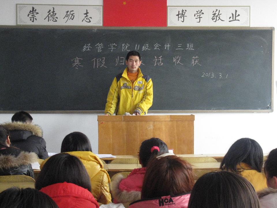 首先是副班长常小东宣布班会开始,并向大家简单明要地说明了该次活动的流程。接着,完成寒假实践工作的同学们上台讲述了实践过程中的感受及收获。第一个是学习委员,她的实践活动并不顺利,访谈中还碰了壁,这令她感受颇深,随着我们渐渐接近社会,难免遭遇人情世故,涉世未深的我们也要慢慢学习接受。之后,班长讲了他做实践的过程和收获,他是联合其他同学一同去学校做活动的。活动开始也算顺利。但到了同学问答环节,几乎无人问及许院,于是他只能通过发出问卷的方式进行调查,所幸效果不错。所以要有在实践中及时处理各种情况的能力,这就要求大家在进行活动之前就考虑到各种可能的情况并做好充分的准备,才能保证有的防矢,顺利完成实践。