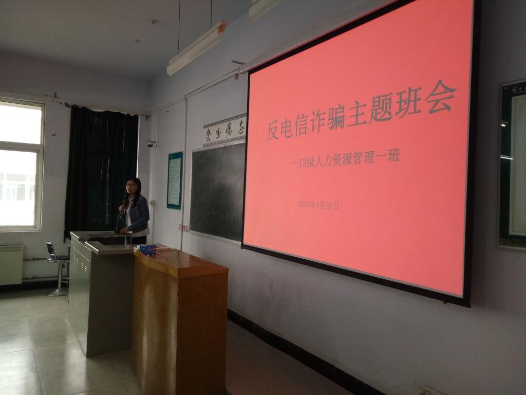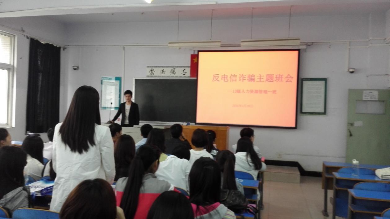 随着科学技术的发展,诈骗由传统的单一形式向电信化转变,诈骗形式越来越新颖,识别难度越来越高。近日来,我校频频发生电信诈骗案件。面对越来越猖獗的电信诈骗,响应学校、院系的提高安全意识的号召,1066vip威尼斯13级人资一班于4月28日在C座教学楼504教室举行“防电信诈骗”的主题班会,旨在时时敲响防诈骗的警钟,提高同学们的自保护能力。