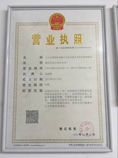 一、公司简介:方正证券股份有限公司是中国首批综合类证券公司,上海证券交易所、深圳证券交易所首批会员,于2010年改制为股份有限公司,并于2011年在上海证券交易所上市,股票代码601901.具有多业务牌照,范围涵盖:证券经纪、期货经纪、投资银行、证券自营、资产管理、研究咨询、IB业务、QFII业务、融资融券、直投业务等。 许昌南关大街证券营业部成立于2014年2月,地址位于七一路于南关大街交叉口北50米,月满楼宾馆2楼。