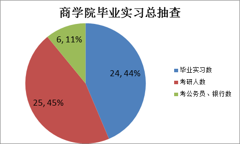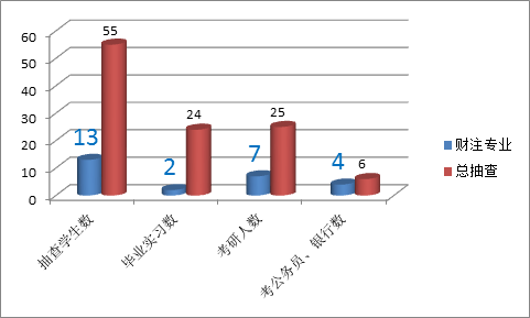 从抽查的总体情况来看,共抽查55人(不含双学位、国教院),实习人数24人,占比44%;专业对口21人,专业不对口3人(工管1人做文员,人资2人做化纤研发部开发员);考研人数25人,占比45%;银行、公务员考试6人,占比11%;参加考研或各类考试的比例为56%。