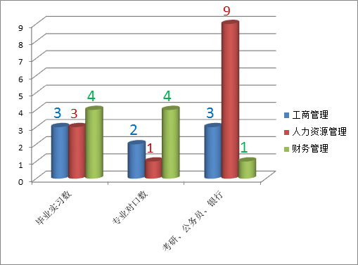 工商管理、人力资源管理、财务管理专业参加毕业实习比例较低,其中工管、人资专业出现毕业实习专业不够对口情况。人力资源管理专业参加考研或公务员银行考试比例较高。